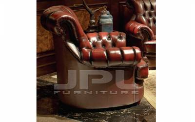 Кожаное кресло в английском стиле Chesterfield. Обтянуто натуральной кожей буйвола с эффектом старения, украшено каретной стяжкой, подбито гвоздями по периметру - ручная работа. Каркас - массив ясеня, наполнитель Сендвич (синтепон в сочетании с полиуретаном). Цвет винный состаренный. На заказ возможны другие варианты отделки.
