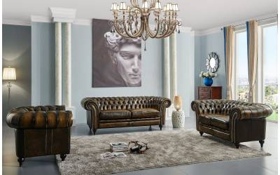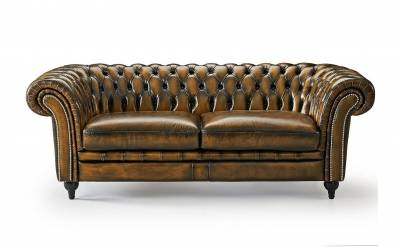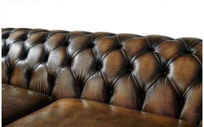 Трехместный кожаный диван Chelsey выполнен в традиционном английском стиле, обтянут состаренной натуральной кожей крупно-рогатого скота, декорирован латунными гвоздиками. Наполнитель-латексный ППУ. Каркас из массива сосны. На заказ доступны другие варианты отделки.