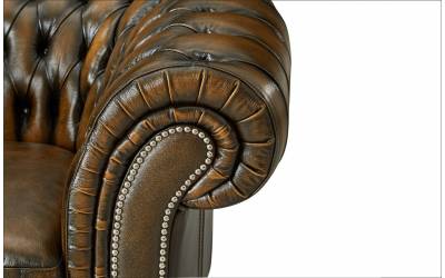Диван выполнен в традиционном английском стиле, обтянут состаренной натуральной кожей крупно-рогатого скота, декорирован латунными гвоздиками. Наполнитель-латексный ППУ. Каркас из массива сосны. На заказ доступны другие варианты отделки.