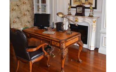 Классический письменный стол из массива ореха, украшен резьбой ручной работы, отделан кучерявым шпоном. Имеет пять выдвижных ящиков с плавным ходом. Доступны другие варианты отделки.