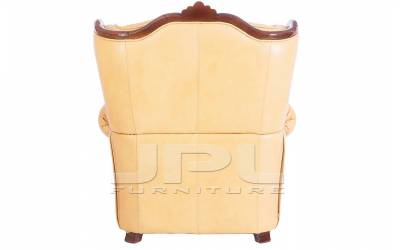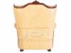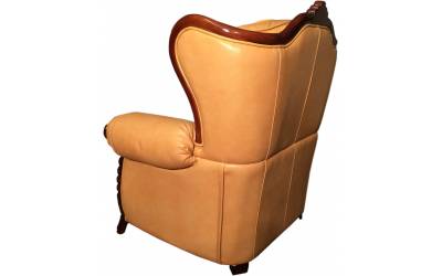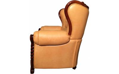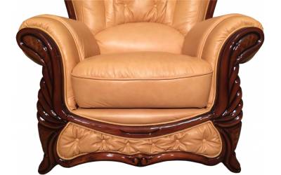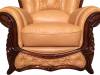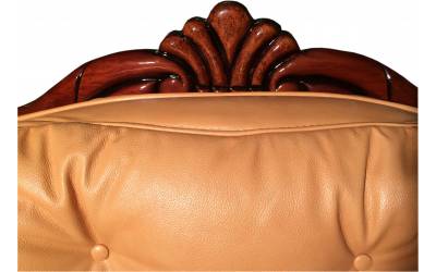 Выбранный резной декор из массива ясеня покрыт лаком высокого качества. Он украшает боковины и верхнюю часть спинки, торцы подлокотников и низ кресла, придавая ему аристократичность и изящество. А необычной формы стяжка по центру спинки и низу изделия добавляет ему дополнительный объем.