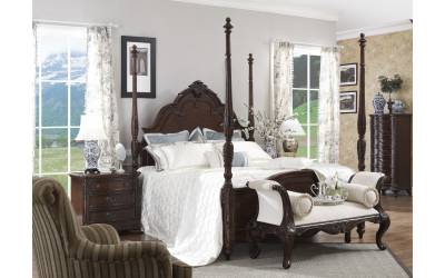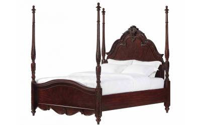 Изысканная американская кровать с резными высокими колонами по углам. Кровать изготовлена из дерева по старинным чертежам XVIII века, фигурное арочное изголовье украшено врезными завитками из дерева, по верху увенчается короной. Отделка и патинирование в темный цвет выполняется мастерами вручную.