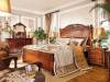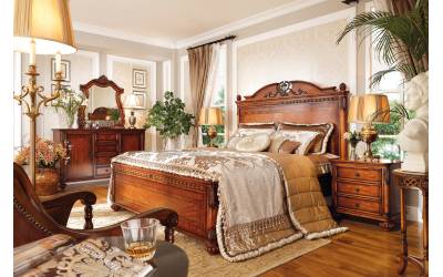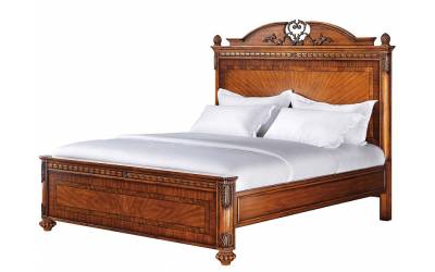 Американская двуспальная кровать из массива дерева, отделана в цвет рыжего ореха с эффектом старения, резная спинка и изножье украшены вишневым шпоном. Спальное место 180*200см. Под заказ доступны другие варианты отделки.