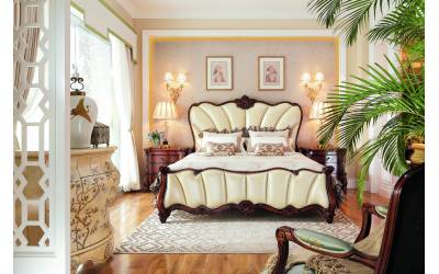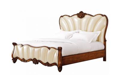 Классическая деревянная кровать с мягким изголовьем. Резная спинка и изножье отделаны натуральной кожей жемчужного цвета, каркас изготовлен из массива черной березы. Спальное место 180*200см. Под заказ доступны другие варианты отделки.