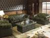 Спинка украшена в технике каретной стяжки, темно-зеленый цвет состарен. Опирается диван на деревянный каркас из твердых пород дерева, наполнение из резиновых лат в сочетании со стальными пружинами "змейка".