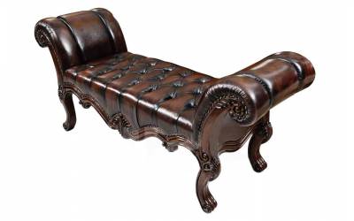 Роскошная банкета достойна стать полноправным членом классического спального гарнитура. Сиденье и подлокотники отделаны бразильской кожей высшего качества – MADRAS. Для ее изготовления берут лучшие шкуры без дефектов, после прохождения специальной обработки их поверхность становится мягкой и потрясающе прочной. Нетоксичный краситель обеспечивает сохранность оттенка в течение многих лет. На сиденье использована «каретная стяжка», благодаря чему наполнитель располагается равномерно, не смещаясь в процессе пользования банкеткой.