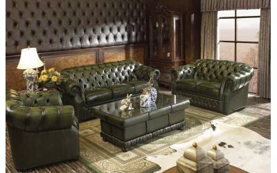 Кожаное кресло в английском стиле Chesterfield. Обтянуто натуральной кожей буйвола с эффектом старения, украшено каретной стяжкой, подбито по периметру мебельными гвоздями - ручная работа. Каркас - массив ясеня, наполнитель Сендвич (синтепон в сочетании с полиуретаном). Цвет зеленый состаренный. На заказ возможны другие варианты отделки.