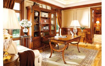 Классический письменный стол из массива ореха, украшен резьбой ручной работы, отделан кучерявым шпоном. Имеет пять выдвижных ящиков с плавным ходом. Доступны другие варианты отделки.