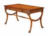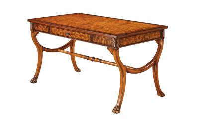 Письменный стол в американском стиле, изготовлен из массива ореха, имеет один выдвижной ящик. Поверхности украшены инкрустацией из шпона шелкового дерева с патиной, опирается на резные ножки в виде звериных лап. Под заказ доступны другие варианты отделки.