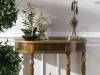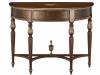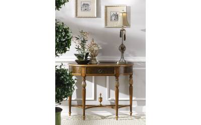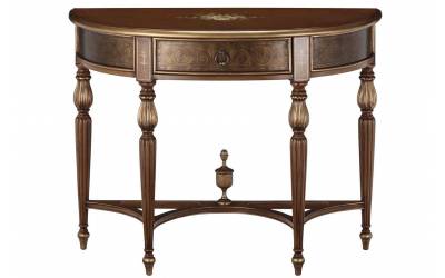 Колониальный консольный стол с закругленной расписной столешницей, опирается на четыре рифленые ножки, внизу соединяются оригинальным подрамником. Фасады украшены металлическими вставками, по контуру стол отделан бронзовой патиной. Оснащен одним ящиком.