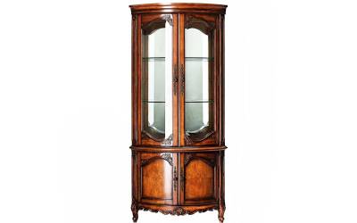 Угловая витрина выполнена в классическом стиле из массива дерева. Витрина состоит из двух частей: верхняя гнутая двухстворчатая витрина с подсветкой и нижняя часть – закрытый гнутыми резными дверями комод.