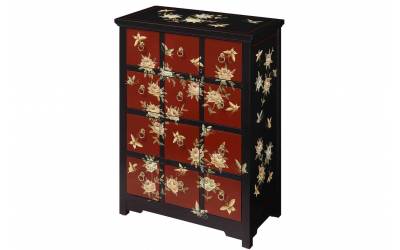 Традиционный китайский расписной комод, выполнен в стиле шинуазри из дерева. Имеет 12 отделении, отделан черным лаком и украшен пейзажем ручной работы "бабочки на розах".