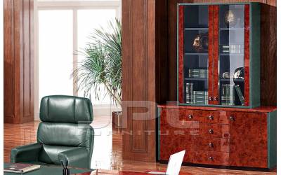 Шкаф не только эстетически привлекателен: пользоваться им очень удобно, поскольку изделие разделено на две функционально разные части. У нижней есть глухие дверцы и закрытые ящики – там хранятся вещи, не предназначенные для обозрения: архивные документы, канцтовары и пр. А верхняя «показывает миру» свое содержимое через прозрачное стекло. Почему бы ни разместить на этих полках красивые сувениры, презентабельные книги и текущую документацию в строгих папках?
