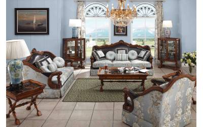 Трехместный классический диван Wilson Collection на каркасе из натурального дерева - орех, украшен резьбой ручной работы. Наполнение из пружинных змеек и резиновых лат делают диван прочным и долговечным. Спинка и подлокотники обиты плотной натуральной кожей буйвола, подушки сидения и декоративные элементы из набивного жаккарда небесно голубого цвета. Диван по периметру подбит латунными гвоздями, финишное покрытие каркаса - состаривание в технике 18 века.