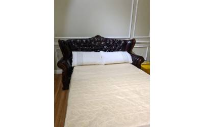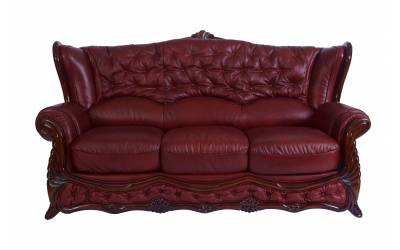 Кожаный трехместный диван Victoria выполнен в английском стиле, обивка из натуральной кожи буйвола. Спинка украшена в технике каретной стяжки, темно-винный цвет состарен, ручная работа. Опирается диван на деревянный каркас из твердых пород дерева, наполнение из резиновых лат в сочетании со стальными пружинами "змейка". Вариант со встроенным спальным местом, размер 140*195 см. Наличие других вариантов отделки, уточняйте у менеджера.