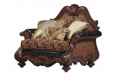 Шикарное кресло выполнено в барочном стиле. Модель с высокой фигурной спинкой в деревянном обрамлении из массива ореха, резьба по дереву производится мастерами вручную. Спинка дивана и подушки сидения обтянуты плотным гобеленом, подлокотники и внешняя сторона натуральной кожей, декорирована мебельными гвоздиками.