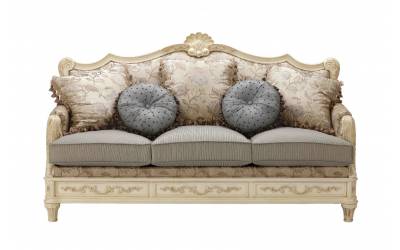 Мягкий диван Grace Collection в деревянной раме, выполнено из массива сосны в стиле Прованс. Обивка из жаккардовой ткани кремового цвета хорошо гармонирует с резными подлокотниками, которые отделанные ванильной эмалью с патиной.