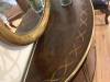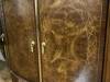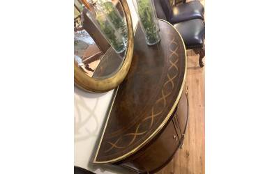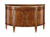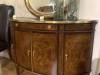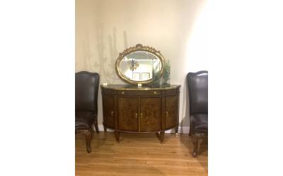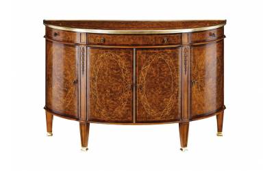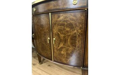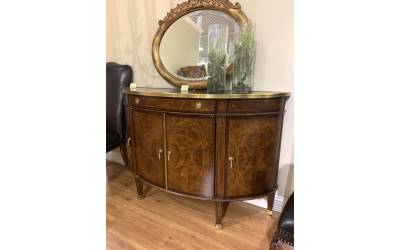 Элегантный комод выполнен в английском стиле, с изогнутым фасадом и радиусной столешницей, четырьмя дверцами и установленными внутри полками. В верху один выдвижной ящик и имитация фасада по бокам. Поверхность покрыта изящной инкрустацией в неоклассическом стиле, опирается комод на четыре ножки с золотыми наконечниками.