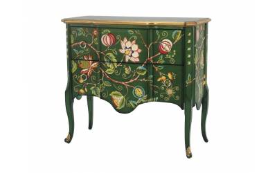Деревянный расписной комод ручной работы, выполнен в стиле колониальном стиле. Имеет четыре выдвижных ящика, гнутые фасады.