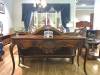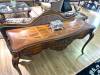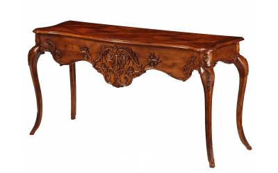 Колониальный консольный стол с закругленной расписной столешницей, опирается на четыре рифленые ножки, внизу соединяются оригинальным подрамником. Фасады украшены металлическими вставками, по контуру стол отделан бронзовой патиной. Оснащен одним ящиком.