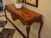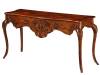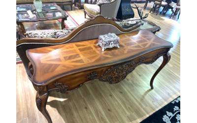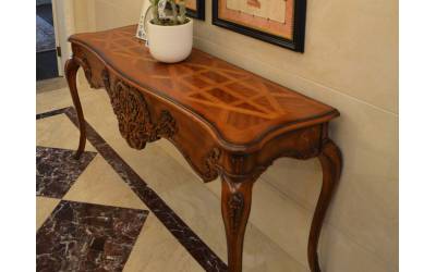 Классическая и функциональная консоль, выполнена из массива речной березы, фигурная столешница инкрустирована листами сувеля березы и вишни, украшена резным кантом по периметру. Имеет два выдвижных ящика. опирается консоль на гнутых ножках кабриоль. Отделка в цвет темного ореха, патинирование. Финишное прозрачное покрытие подчеркивает натуральную красоту дерева.