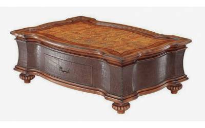 Стол журнальный коллекции «Carnegie Collection» выполнен в колониальном стиле. Отделка натуральной кожей с тиснением под крокодила. Природный рисунок древесины подчеркивает натуральную красоту и естественность, покрытие из высококачественного матового лака. По центру размещен ящик для чайных принадлежностей.